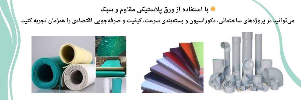 - ورق PVC که در ساختمانسازی، تابلوهای تبلیغاتی و تجهیزات پزشکی استفاده میشود و به دلیل انعطاف بالا، نصب آسان و دوام مناسب، بسیار مورد توجه قرار گرفته است
